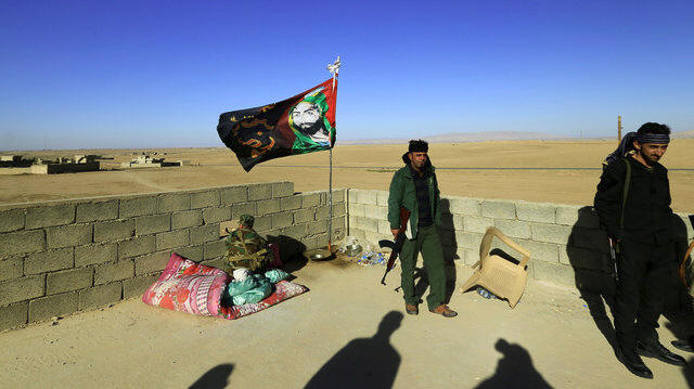 Shi'ite fighters stand with their weapons on the top of a building