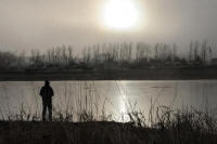 A person looks at the river in an encampment during a protest