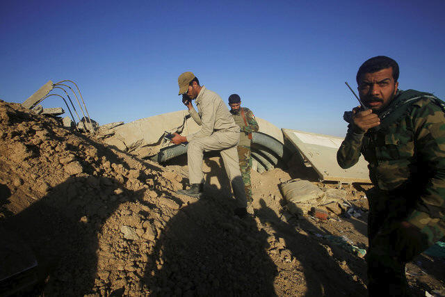 behind a berm during a battle with Islamic State militants at