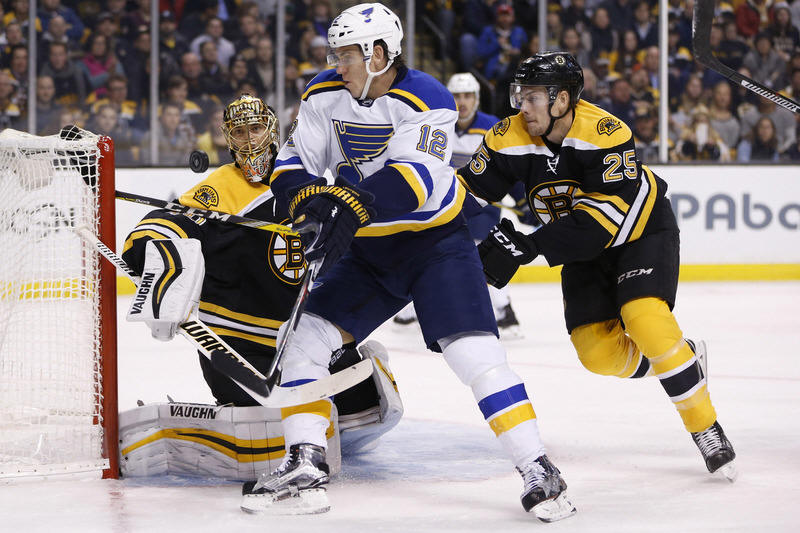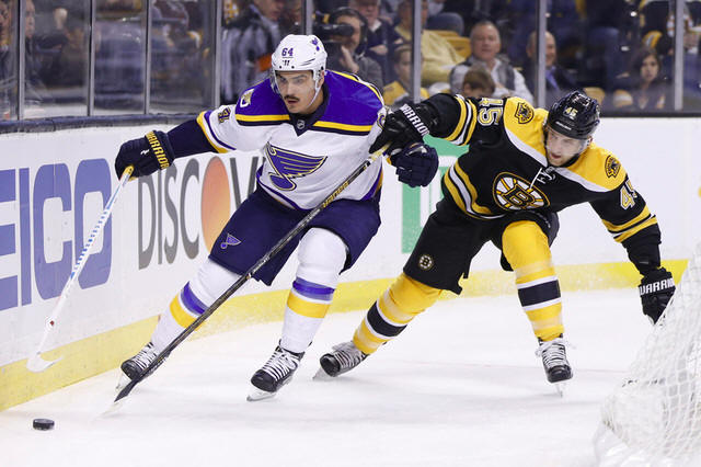 Blues right wing Nail Yakupov (64) and Boston Bruins defenseman