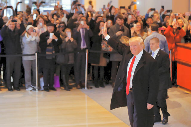 President-elect Donald Trump reacts to a crowd gathered in the lobby