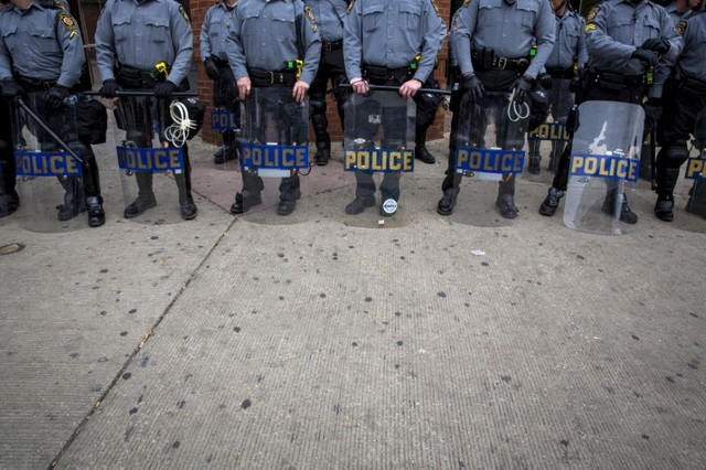 Police line up at North Ave and Pennsylvania Ave in Baltimore,