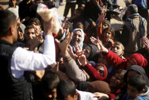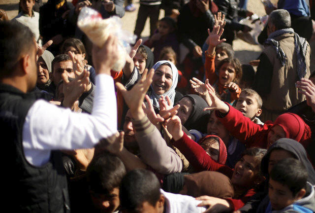 gather to receive food supplies in a distribution point at Khazer