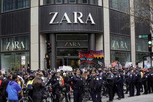 Demonstrators block access to a store during a protest intending to