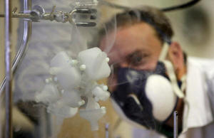 Scientist Frantisek Lizal looks at a model of a functioning human lung