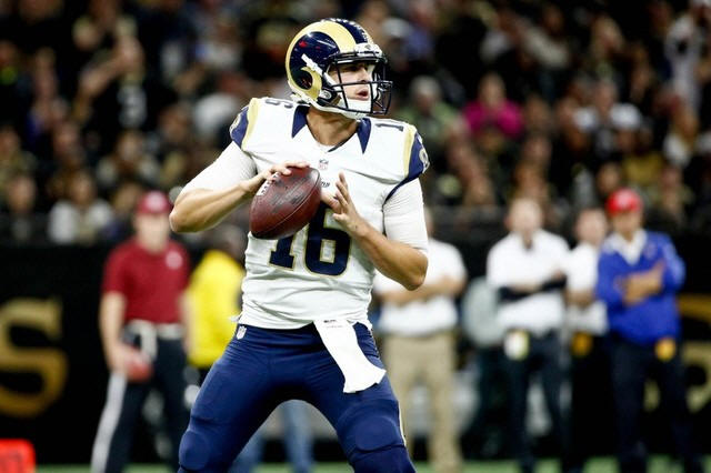 Rams quarterback Jared Goff (16) drops back to pass against the New