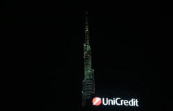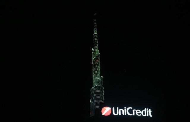 The Unicredit bank logo is seen on top of the headquader at the Porta Nuova district downtown Milan , Italy, March 10, 2016. REUTERS/Stefano Rellandini |