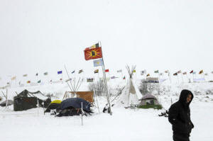 The Oceti Sakowin camp is seen in a snow storm during a protest