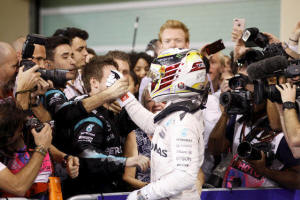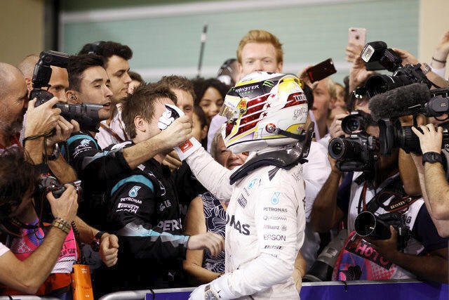Mercedes' Formula One driver Lewis Hamilton of Britain celebrates