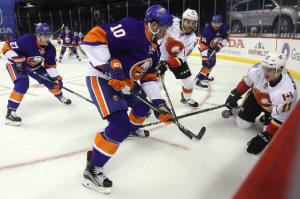 New York Islanders center Alan Quine (10) and Calgary Flames right