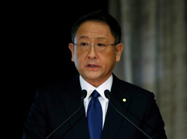 Toyota Motor Corp President Akio Toyoda speaks during their joint