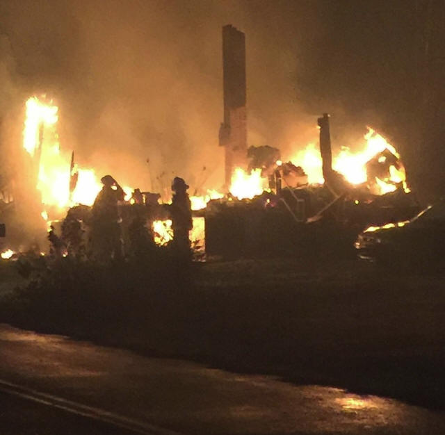 Firefighters stand by a destroyed home after a wildfire forced the