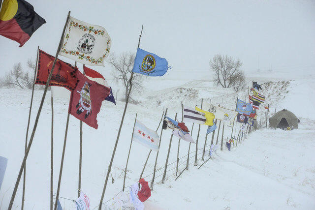 The Oceti Sakowin camp is seen in a snow storm during a protest