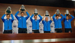 Members of the Argentina's Davis Cup tennis team hold up trophies