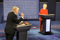 Democratic U.S. presidential nominee Hillary Clinton listens