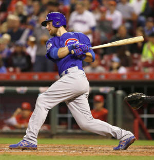 Cubs second baseman Ben Zobrist hits a double against the Cincinnati