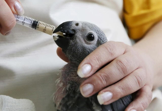 An employee feeds a one-month-old African grey parrot at the Royev