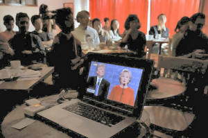 People watch live broadcast of the first U.S. presidential debate