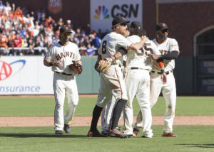 (2) celebrate after defeating the Los Angeles Dodgers 7-1 at AT&T
