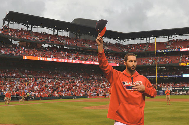 Cardinals starting pitcher Adam Wainwright (50) salutes the fans