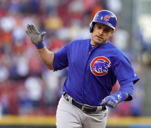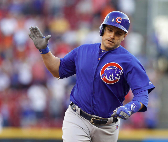 Cubs catcher Miguel Montero (47) reacts as he rounds the bases after