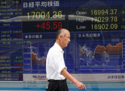 A man walks past a stock quotation board outside a brokerage in