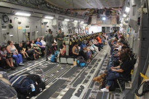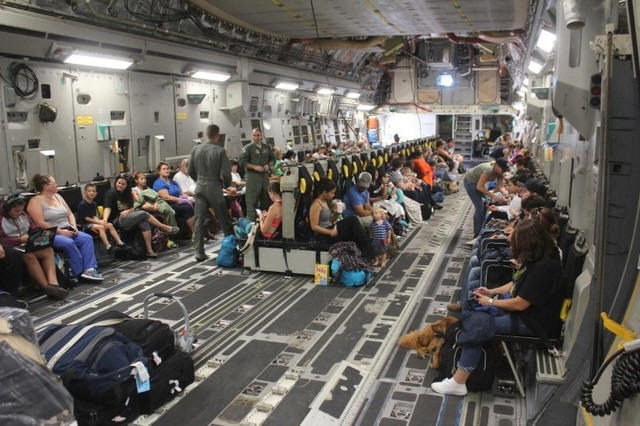 Families settle into their seats aboard a Boeing C-17A Globemaster