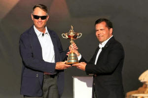 Team USA captain Davis Love III is presented the Ryder Cup by PGA of
