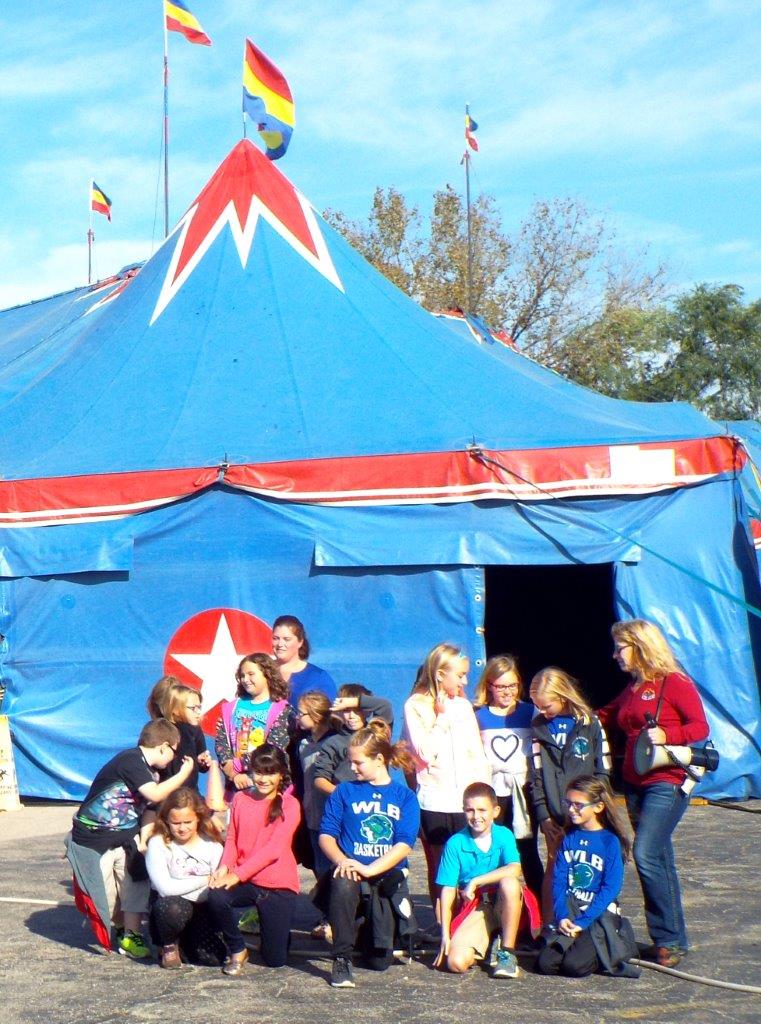 As quick as the Kelly Miller Circus tents were being erected, Ringmaster Rebecca Osteroff (far right with megaphone) began giving tours. West Lincoln Broadwell students were among the early crowd.