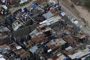 People walk down the street next to destroyed houses after Hurricane