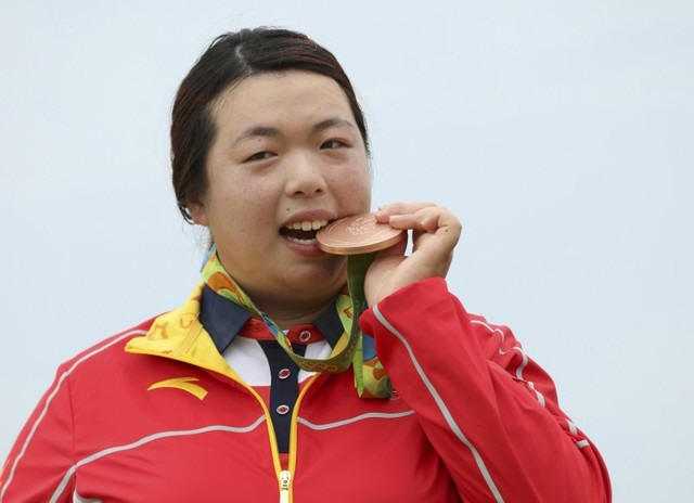 Shanshan Feng of China bites on her bronze medal in women's Olympic