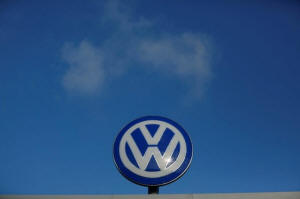 A Volkwagen compnay logo sits atop the VW factory in Wolfsburg,