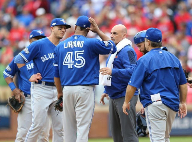 Toronto Blue Jays starting pitcher Francisco Liriano (45) is checked
