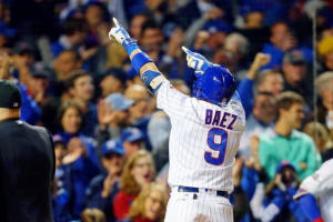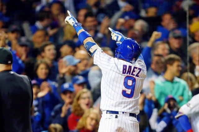 Cubs second baseman Javier Baez (9) acknowledges the crowd after