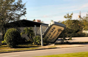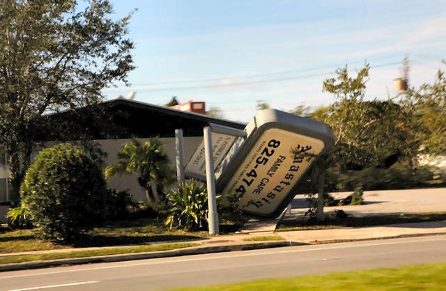 A damaged sign is seen on St. Augustine Beach in the aftermath of
