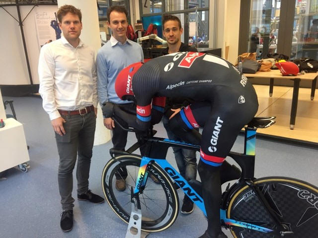 sports scientist at Team Giant-Alpecin, pose with a 3D-printed