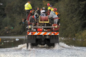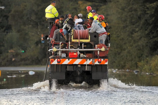 Evacuees ride on a truck as they are evacuated from a flood area as