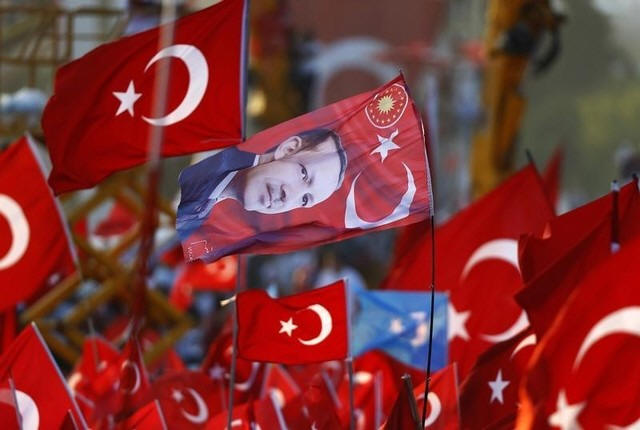A flag with the picture of Turkey's President Tayyip Erdogan is seen