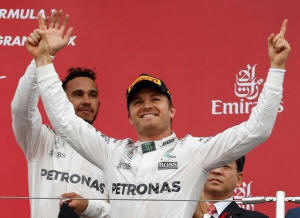 while Rosberg won, is now 33 points behind the German and even