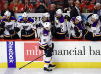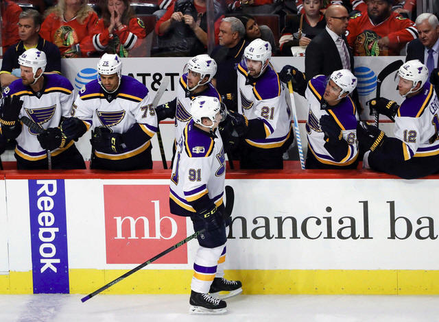 Blues right wing Vladimir Tarasenko (91) celebrates with