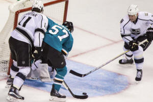 Sharks center Tommy Wingels (57) tries to shoot against the Los