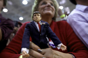 A supporter of Donald Trump holds a Trump doll as she listens to him