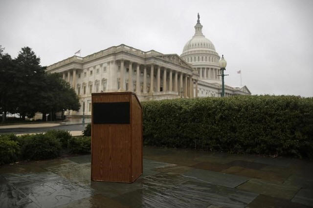 An empty speaker's lectern is seen in the rain outside the U.S.