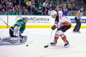 Stars goalie Antti Niemi (31) allows a short handed goal to Anaheim