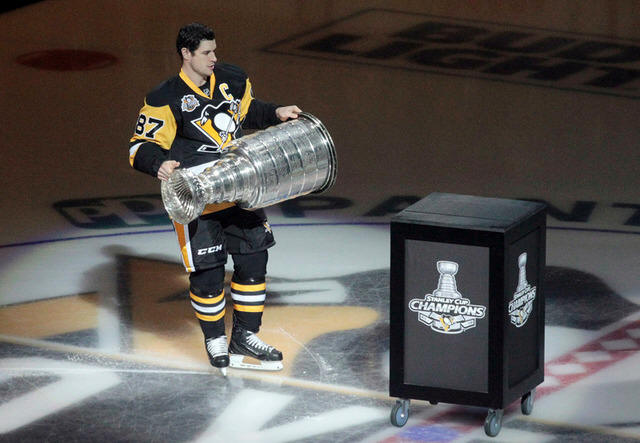Penguins center Sidney Crosby (87) skates with the Stanley Cup prior