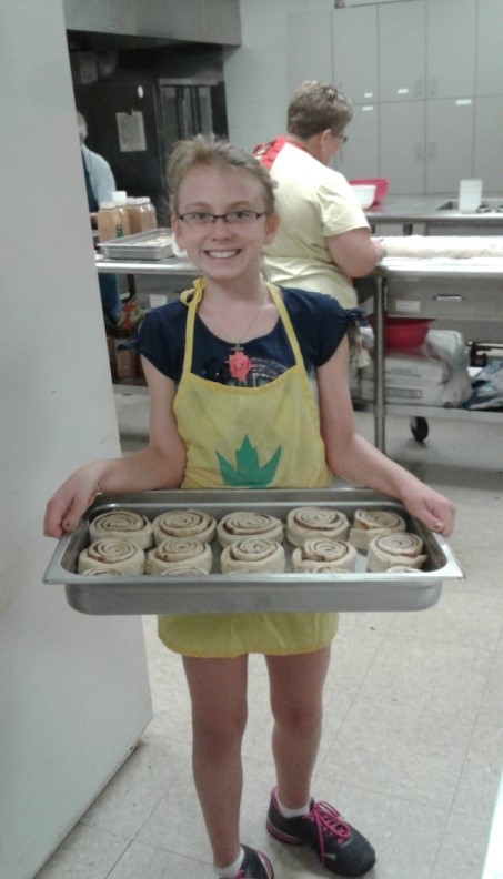 with a tray of cinnamon rolls ready for baking. The young Harvest
