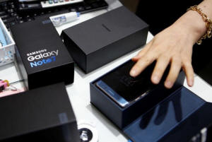 An employee checks an exchanged Samsung Electronics' Galaxy Note 7