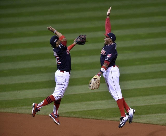 Indians players Francisco Lindor (12) and Rajai Davis (20) celebrate