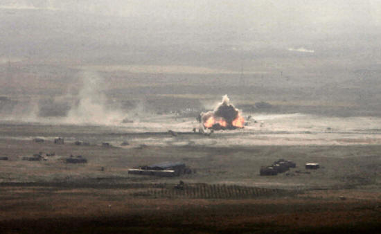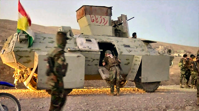 A soldier looks inside a armoured personnel carrier in Khazer,