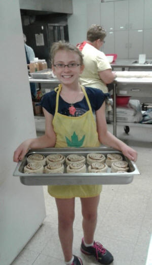 Among the “Rollers” was ten year old, Elaine Hyde, granddaughter of Gary and Lindsey Hughes, who was honing her roll making skills under the careful tutelage of both grandparents. Elaine is pictured with a tray of cinnamon rolls ready for baking. The young Harvest volunteer is learning the cinnamon roll making process, step by step, under her grandparents careful mentoring.